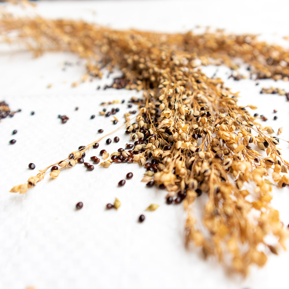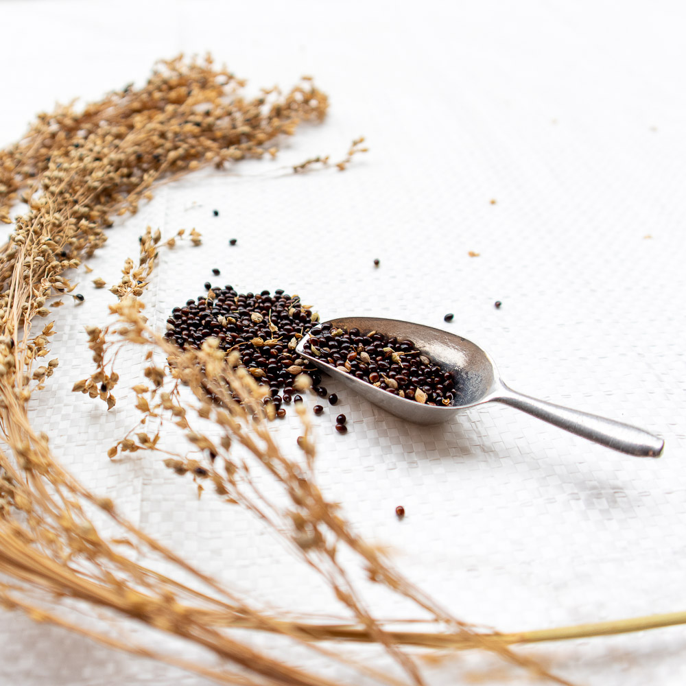 Der Exot unter den Rispenhirsen bringt durch die langgezogene Rispe und die tiefschwarzen Körner Abwechslung in den Speiseplan und dient als beschäftigendes Funfutter.