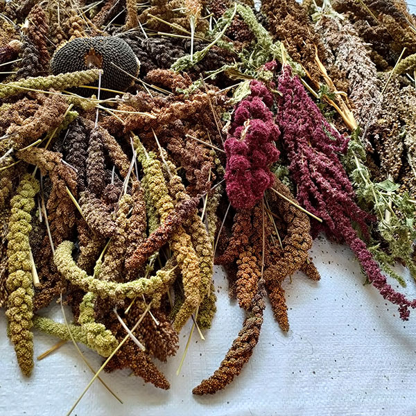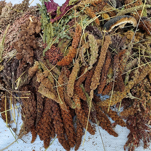 In veränderlichen Mengen können folgende verschiedene Sorten enthalten sein: Kolben- und Rispenhirsen, Sorghum- und Sudangrasarten und Besondere Leckereien wie Amaranth, Sonnenblumen.
